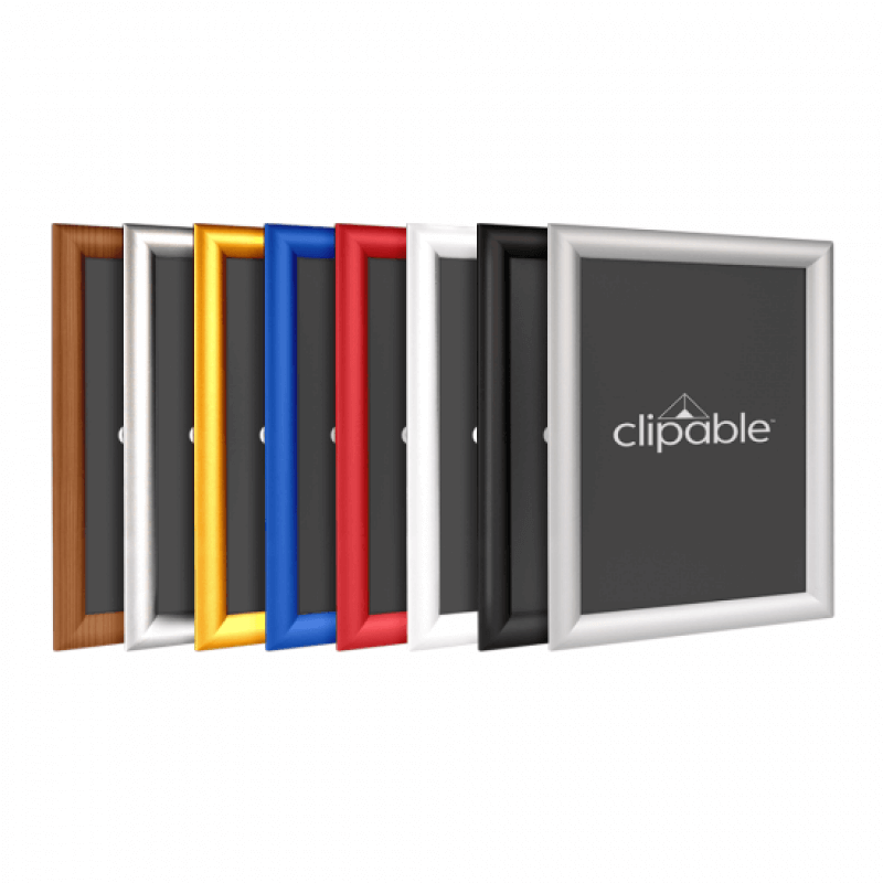 The clip frame is available in silver, black, red, white, blue, gold, chrome or in a wood effect finish. it is available in A5, A4, A3, A2, A1 or A0 paper sizes. The frame is 25mm wide, creating a 10mm overlap of your poster on each side, and the frame projects approximately 20mm from the wall.